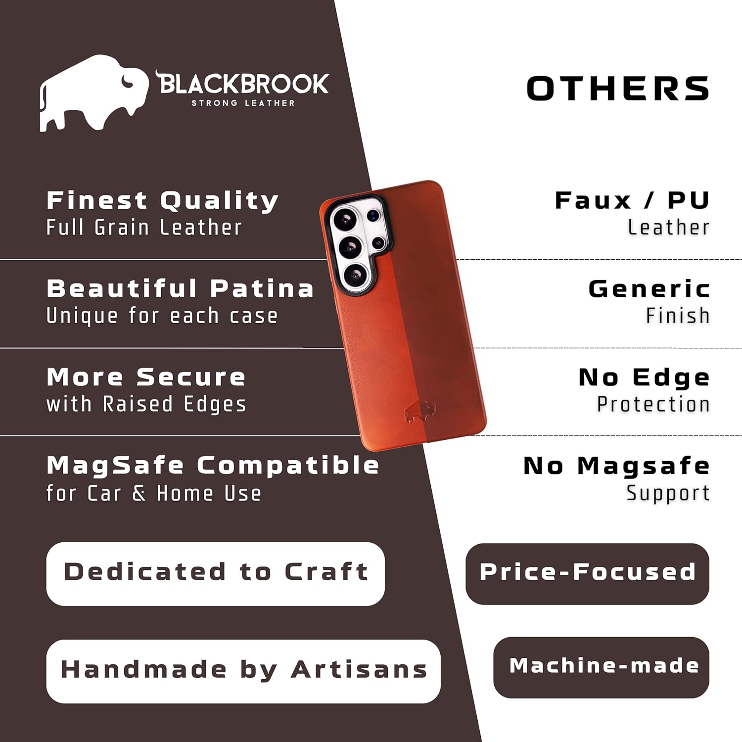 Barlow Leather Case for Samsung Galaxy S26 Ultra – Made by Artisans, Not Machines The Barlow Snap-On Case for Samsung Galaxy S26 Ultra blends minimalist design with reliable everyday protection. Handcrafted from full grain leather, it delivers a refined appearance while maintaining a slim, lightweight profile that feels natural in your hand or pocket. The exterior leather softens and gains character with time, developing a unique patina that reflects your daily use. Inside, a soft suede lining helps protect your device from scratches and minor impact without adding unnecessary bulk. Designed with precision cutouts and a secure snap-on structure, Barlow ensures easy access to all buttons, ports, and speakers. Built-in magnetic alignment is compatible with MagSafe chargers and accessories and remains compatible with wireless charging, allowing effortless power without removing the case. Barlow also works seamlessly with BlackBrook Carter magnetic wallet models, giving you the flexibility to expand your everyday carry when needed. BlackBrook cases are handcrafted leather goods for you, made by artisans, not machines.